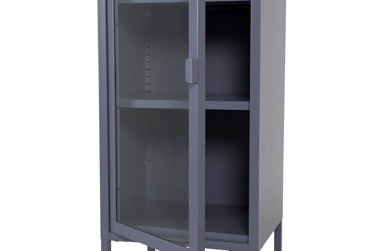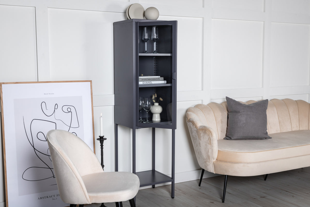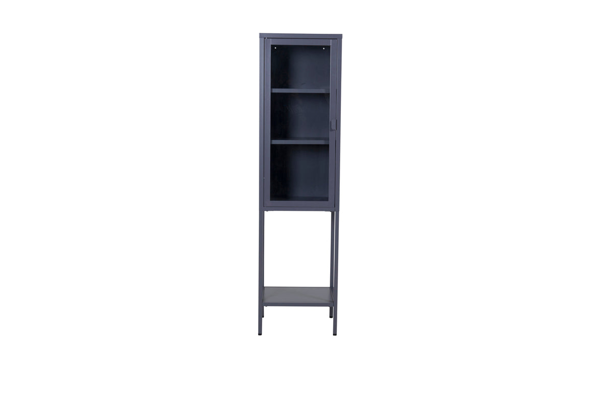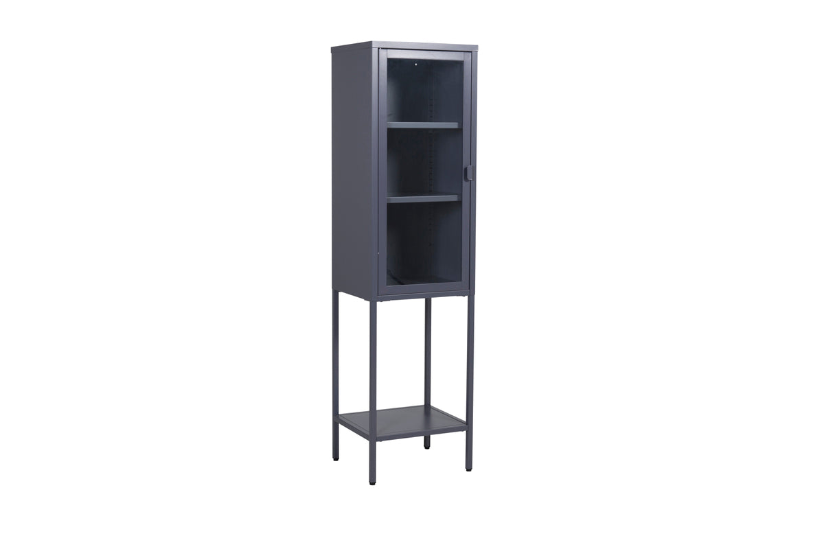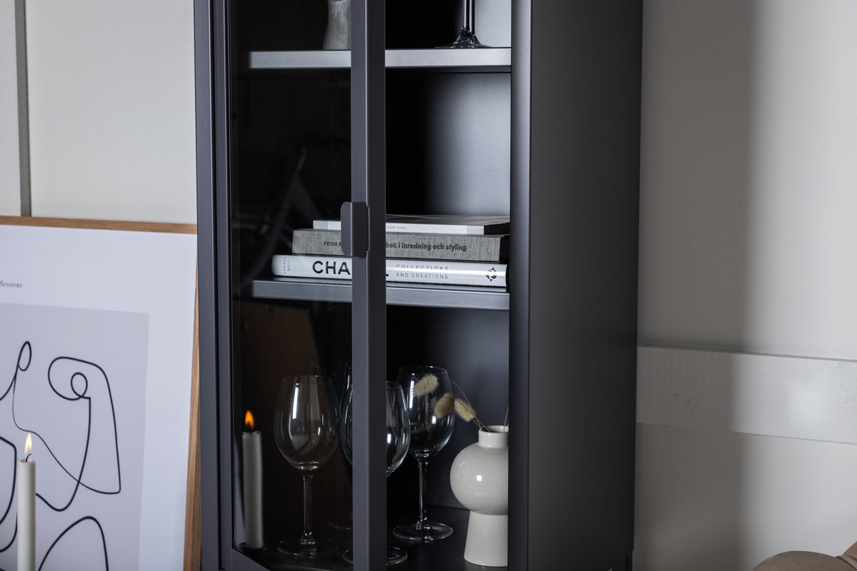 Levykaapit ovat suosittu ja käytännöllinen lisä sisustukseen! Tässä Misha-sarjan kaapissa on modernin teollisen muotoilun mukainen, komean korkea kokonaisuus, joka on valmistettu jauhemaalatusta mustasta teräksestä ja jossa on lasiovi. Lasi päästää kaappiin ihanaa valoa ja tuo kauniisti esiin kaiken, millä täytät sen. Kaapissa on kolme älykästä reliefipintaa, käytä posliinin, kirjojen säilytykseen tai koristele kauniilla sisustuksen yksityiskohdilla. Mitat: Pituus: 40,5 cm, leveys: 35 cm, korkeus: 150 cm. Vaatii kevyemmän kokoonpanon. Hoito-ohjeita: Alumiini ja kromi ovat kaksi materiaalia, jotka hylkivät likaa ja nesteitä vastaan. Sinun on kuitenkin oltava tietoinen siitä, että vesi voi aiheuttaa tahroja ja ruostetta. Varmista siksi, että pinta pyyhitään pehmeällä kostutetulla liinalla ja saippuavedellä. Jos tahrat tai ruoste istuvat liian kovaa, suositellaan pehmeää liinaa, joka on kostutettu puhtaaseen alkoholiin.