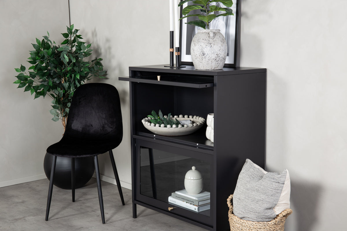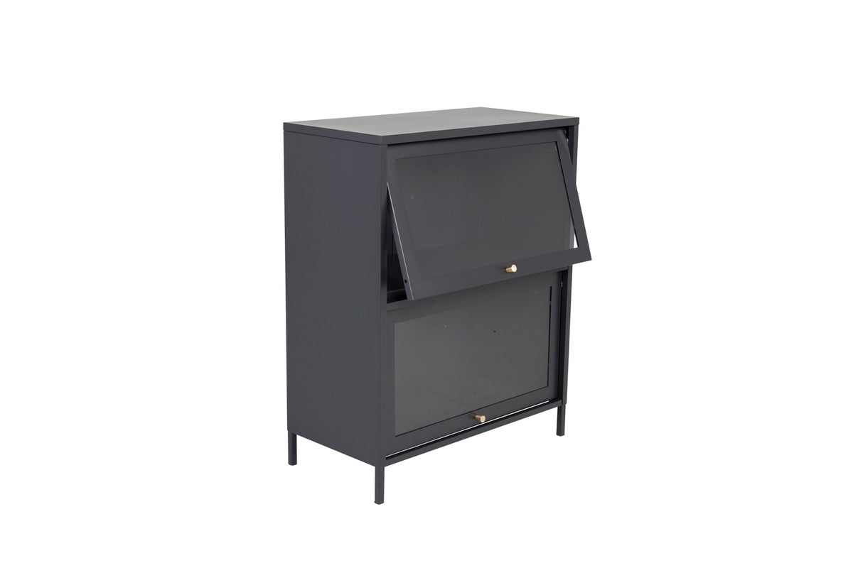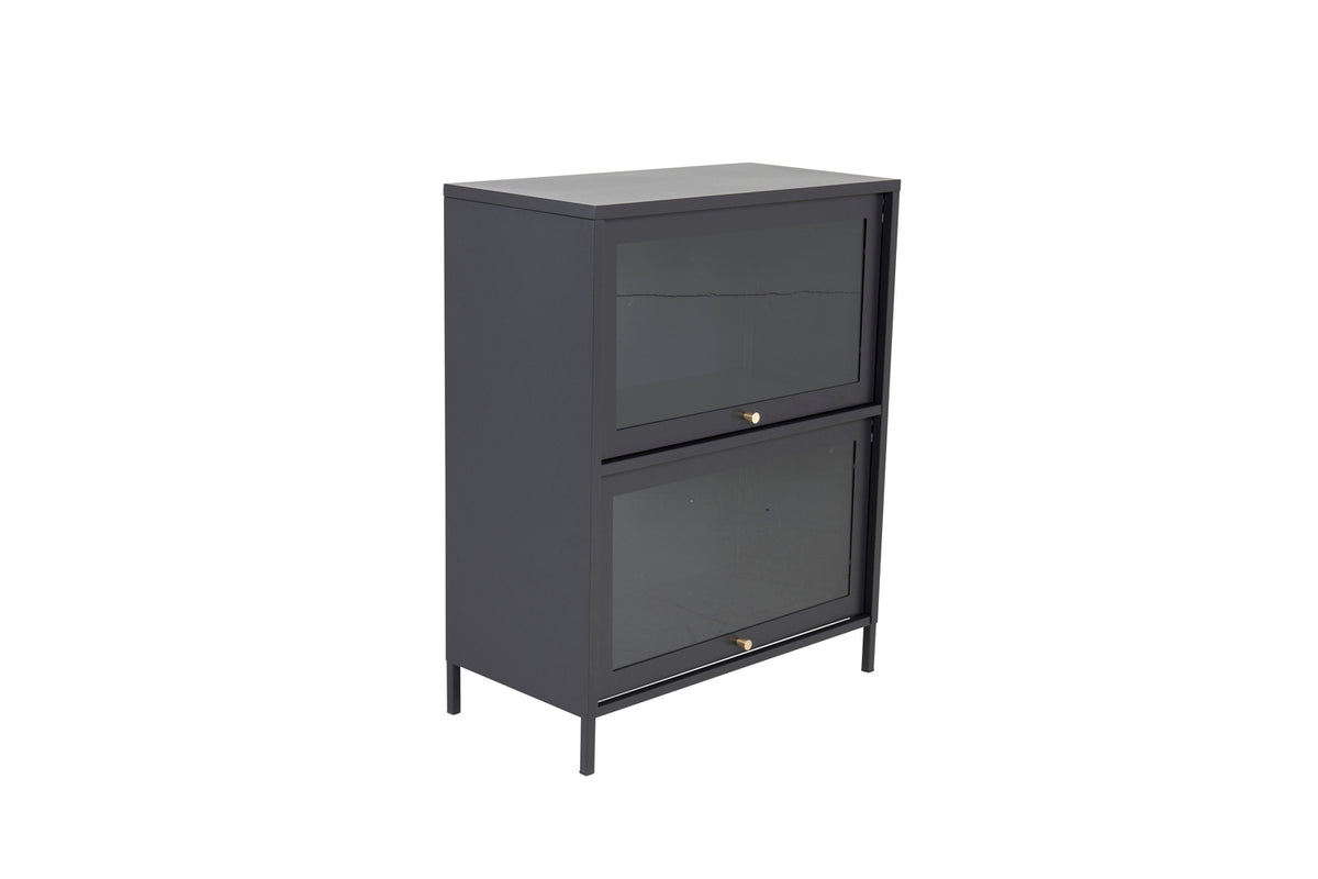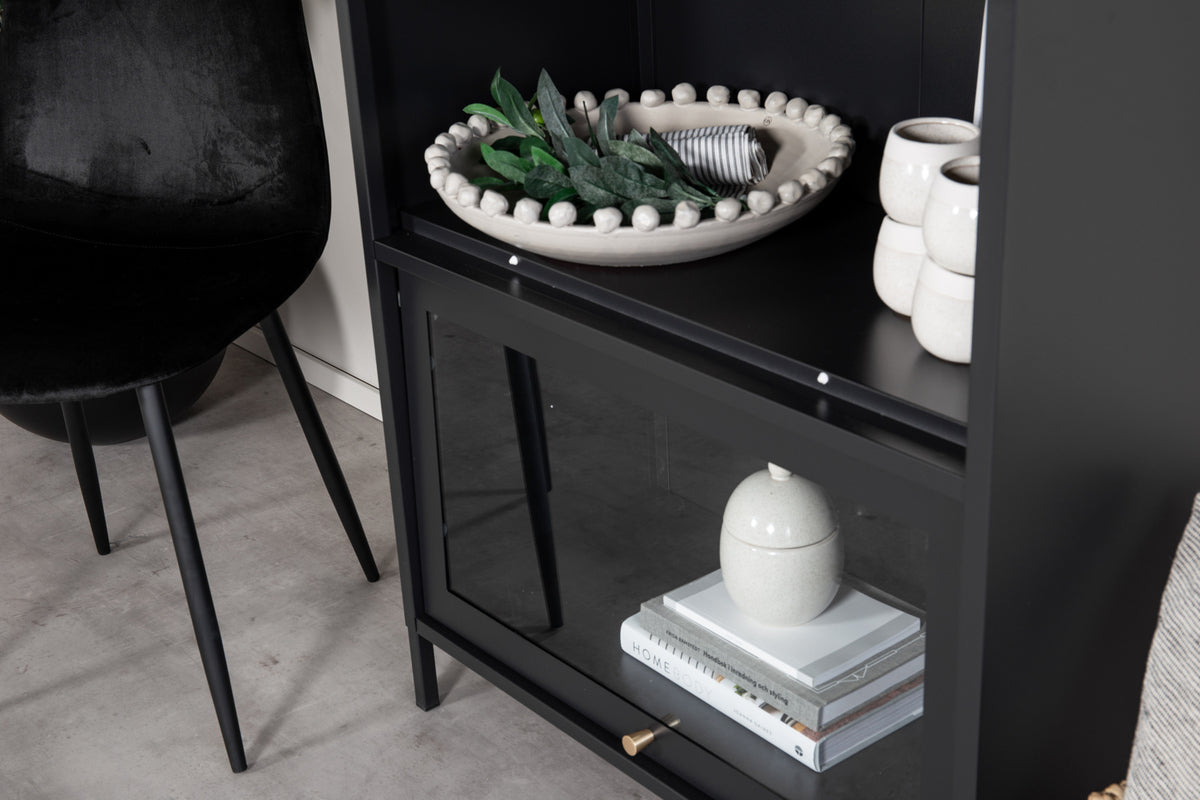 Trendikäs pelti sarjassa Bakval. Muotoilu on hyvin harkittua modernia teollista muotoa mustaksi pulverimaalattua terästä, jossa on kaksi lasiovea. Kirkas lasi päästää kaappiin ihanaa valoa ja sitä kehystävät mustaksi pulverimaalattu teräs ja yksityiskohtaiset messinkiset nupit. Lasiovet avautuvat ylöspäin. Vitriinikaappi nojaa neljään kapeaan jalkaan, jotka ovat pulverimaalattua mustaa terästä ja antavat kaapille ilmavan ulkonäön. Mitat: Pituus: 80 cm, leveys: 40 cm, korkeus: 100 cm. Vaatii kevyemmän kokoonpanon. Tyylikäs säilytyskaluste, jonka voit täyttää kaikella kauniista posliinista kirjoihin ja tyylikkäisiin sisustuselementteihin. Hoito-ohjeita: Alumiini ja kromi ovat kaksi materiaalia, jotka hylkivät likaa ja nesteitä vastaan. Sinun on kuitenkin oltava tietoinen siitä, että veden pitäisi aiheuttaa tahroja ja ruostetta. Varmista siksi, että pinta pyyhitään pehmeällä kostutetulla liinalla ja saippuavedellä. Jos tahrat tai ruoste istuvat liian kovaa, suositellaan pehmeää liinaa, joka on kostutettu puhtaaseen alkoholiin.
