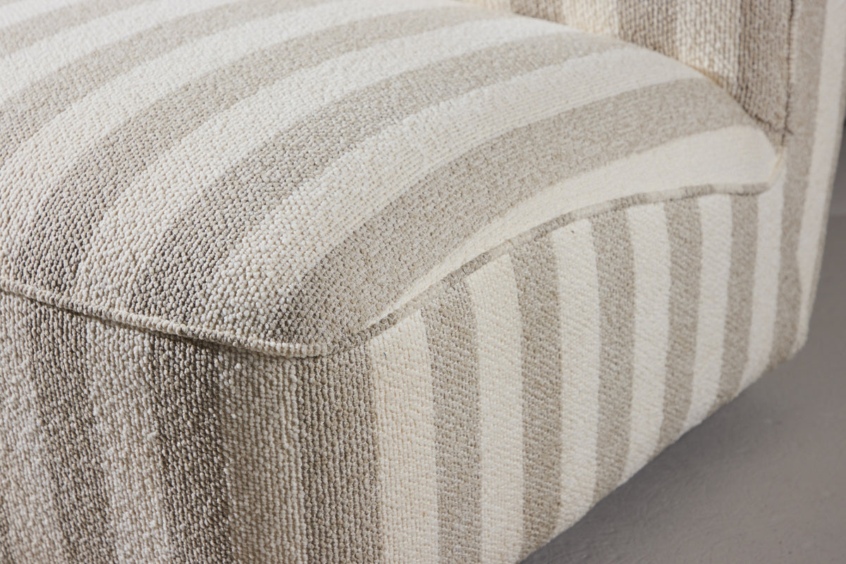 My on kutsuva käsinojaton lepotuoli, joka on suunniteltu tarjoamaan sekä mukavuutta että luonnetta. Runsaasti pehmustettu istuin ja selkänoja tarjoavat miellyttävän istumakokemuksen - täydellinen rentoutumiseen, lukemiseen tai pitkiin keskusteluihin. Tuoli erottuu edukseen kangasverhoilullaan, jossa on leveät valkoiset ja beiget raidat, jotka antavat sille leikkisän mutta tyylikkään ilmeen. Minimalistisen muotonsa ansiosta My sopii yhtä hyvin olohuoneeseen kuin makuuhuoneeseen tai eteiseen - joustava ja tyylikäs nojatuoli moderniin kotiin.