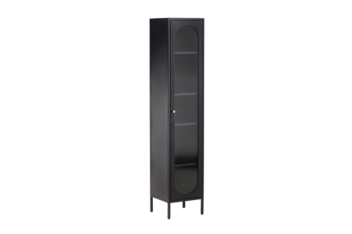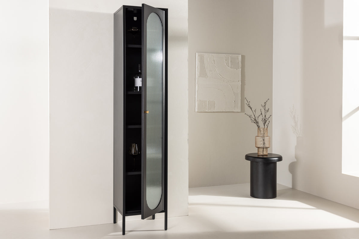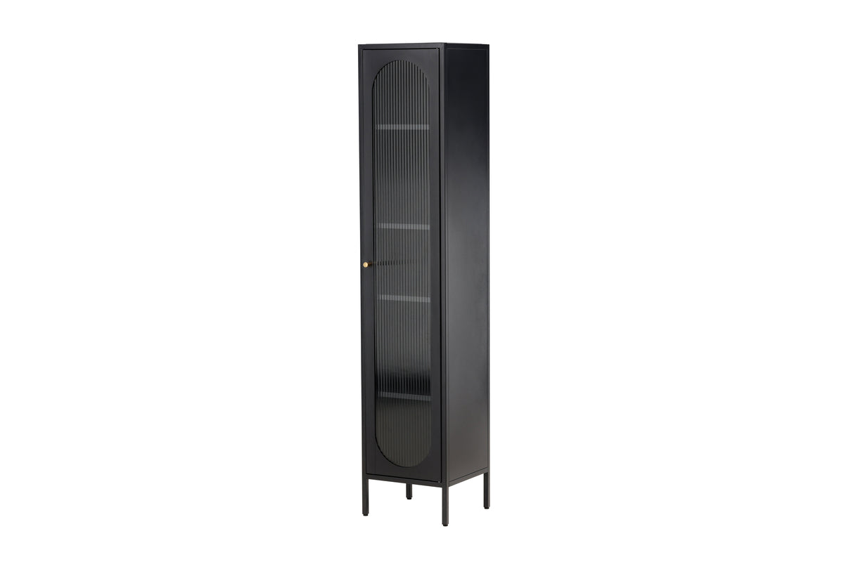 Cali-teräskaapin avulla saat tyylikkään ja käytännöllisen säilytysratkaisun, jossa yhdistyvät tyyli ja toiminnallisuus. Teräksestä valmistettu Cali-kaappi on ilmeikäs ja luotettava huonekalu, joka sopii täydellisesti sekä moderniin että perinteiseen sisustukseen. Tyylikäs musta väri antaa kaapille ajattoman luonteen, joka täydentää kodin sisustusta tyylikkäästi. Kaapissa on neljä tilavaa hyllyä, jotka tarjoavat runsaasti tilaa järjestämiseen. Kaapin ovi on valmistettu aaltoilevasta lasista, joka tuo esineeseen hienovaraista tekstuuria ja ainutlaatuisen visuaalisen ulottuvuuden. Korosta sisustustasi Cali-teräskaapilla ja luo kotiisi tyylikäs ja järjestäytynyt ilmapiiri. Sijoitat sen sitten olohuoneeseen, makuuhuoneeseen tai toimistoon, Cali on käytännöllinen ja tyylikäs lisä sisustukseesi.