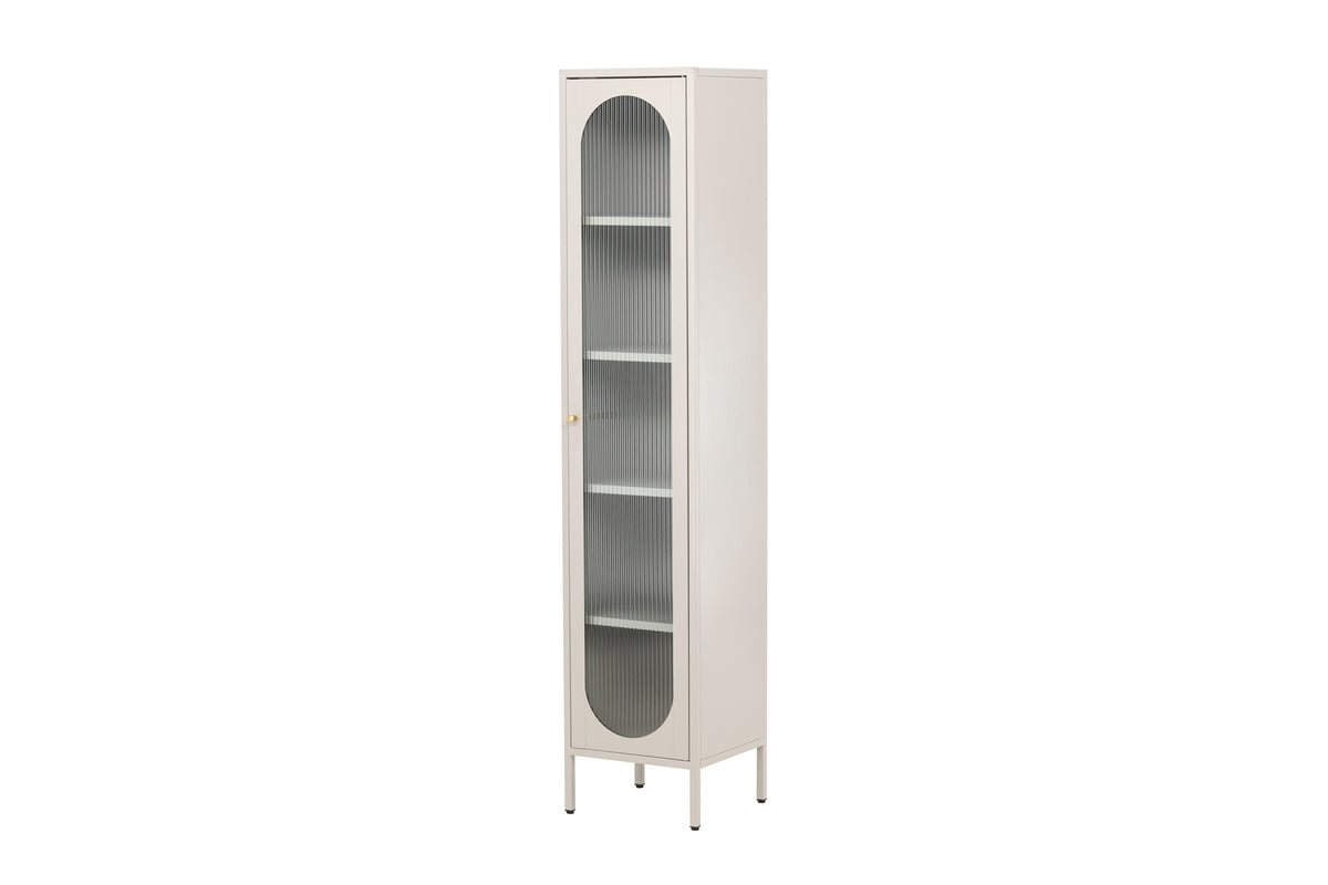 Cali-teräskaapin avulla saat tyylikkään ja käytännöllisen säilytysratkaisun, jossa yhdistyvät tyyli ja toiminnallisuus. Teräksestä valmistettu Cali-kaappi on ilmeikäs ja luotettava huonekalu, joka sopii täydellisesti sekä moderniin että perinteiseen sisustukseen. Tyylikäs musta väri antaa kaapille ajattoman luonteen, joka täydentää kodin sisustusta tyylikkäästi. Kaapissa on neljä tilavaa hyllyä, jotka tarjoavat runsaasti tilaa järjestämiseen. Kaapin ovi on valmistettu aaltoilevasta lasista, joka tuo esineeseen hienovaraista tekstuuria ja ainutlaatuisen visuaalisen ulottuvuuden. Korosta sisustustasi Cali-teräskaapilla ja luo kotiisi tyylikäs ja järjestäytynyt ilmapiiri. Sijoitat sen sitten olohuoneeseen, makuuhuoneeseen tai toimistoon, Cali on käytännöllinen ja tyylikäs lisä sisustukseesi.