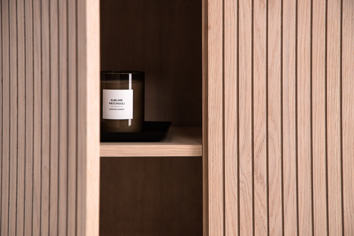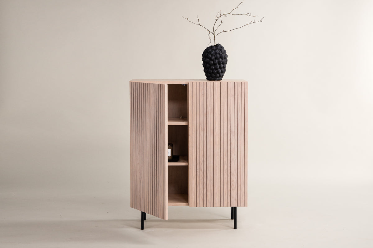 Samoin tyylikäs kuin älykäs säilytysratkaisu kotiisi! Tämä Björkön-sarjan korkeareliefinen kaappi on saatavana eri väreissä ja koossa, ja se nousee nopeasti trendilistoille tyylikkään muotoilunsa ansiosta. Kaapissa on kaksi aukkoa kylkikaappi-lookissa ja kolme hyllyä piilosäilytystä varten. Valmistettu mustasta viilusta ja nostettu kapeilla mustasta teräksestä valmistetuilla jaloilla. Sijoita sivupöydäksi kauniiden koristeiden ja kynttilänjalustojen kanssa tai piilotetuksi vitriinikaapiksi - vain mielikuvitus asettaa rajat!