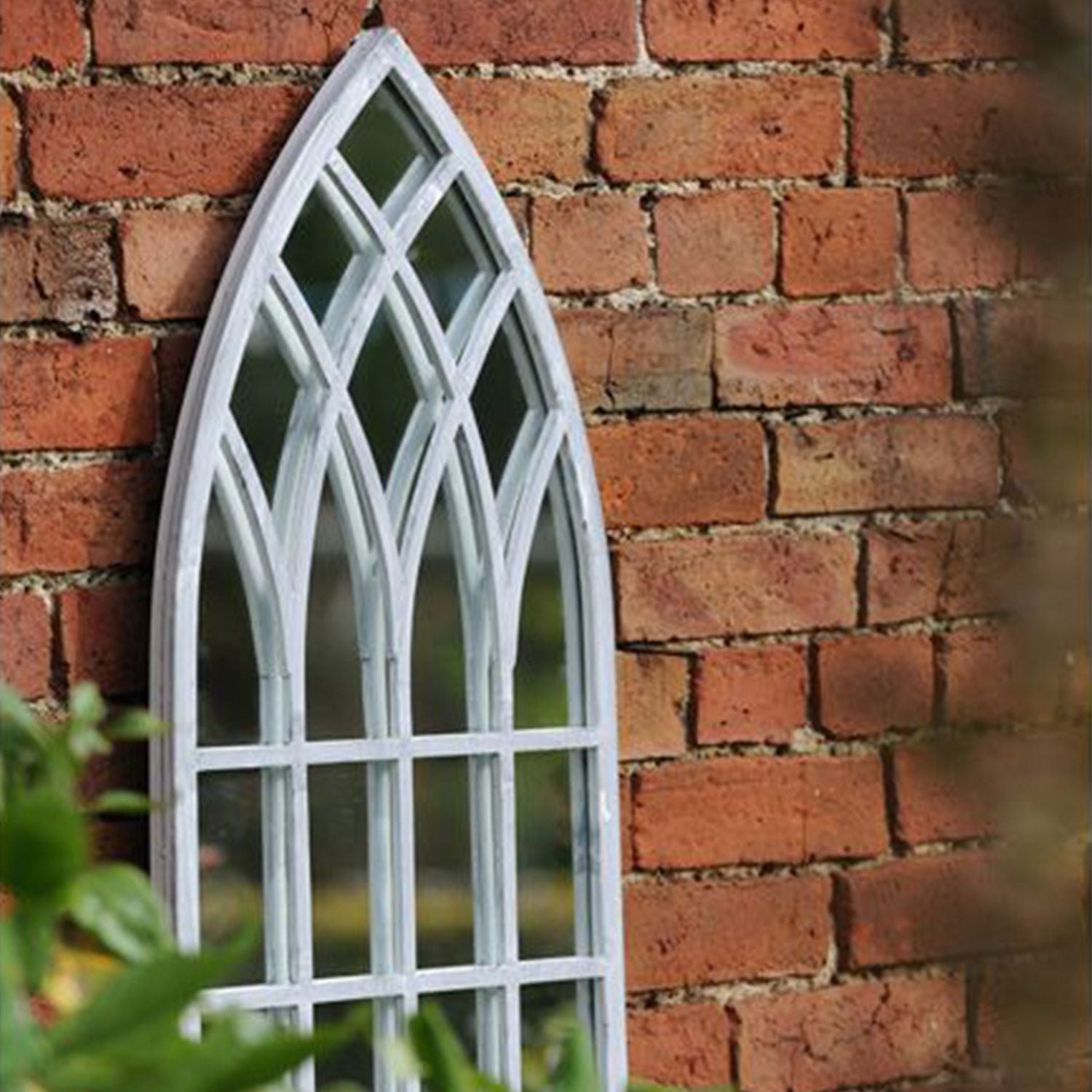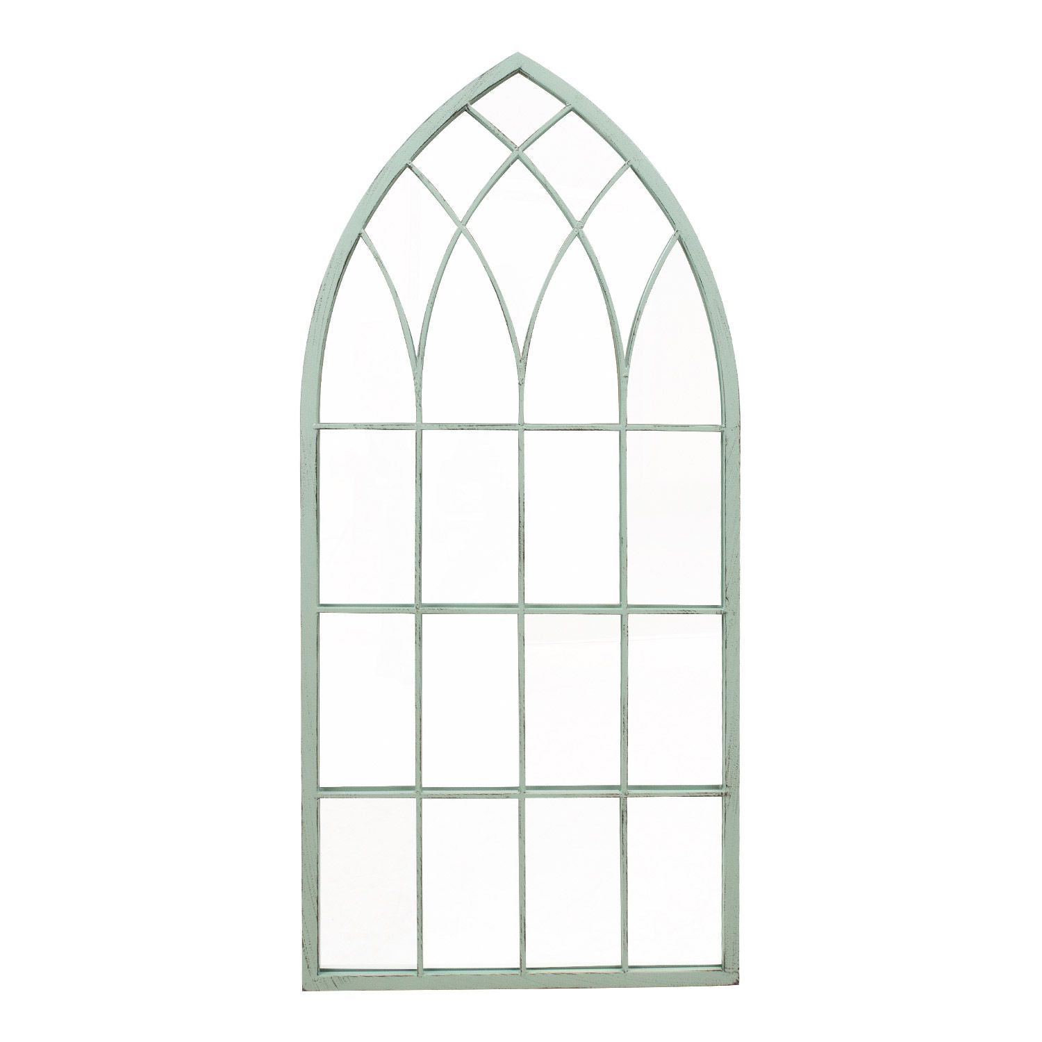 A garden mirror suitable for both indoor and outdoor use. The mirror with an antique green metal frame brings a decorative element to both the balcony and the garden.