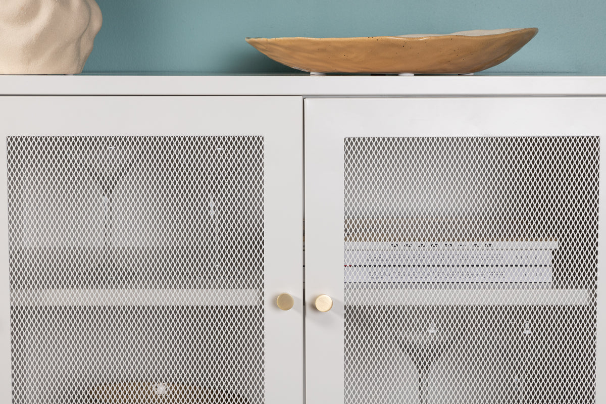 Malla - moderni kaappi kovassa teollisessa muotoilussa, jossa on herkulliset verkko-ovet ja valkoiseksi pulverimaalattua terästä olevat jalat, joissa on 2 älykästä hyllyä helpotusta varten. Kaappia nostavat kapeat, korkeat jalat, jotka luovat ilmavan tunnelman ja helpottavat myös pölynimurin käyttöä. Täydellinen säilytyskaluste kaikelle haluamallesi - täytä se posliinilla, kirjoilla tai kauniilla koristeilla. Joustavan kokonsa ja tyylikkään ulkomuotonsa ansiosta kaappi on helppo sijoittaa ja se sopii hyvin kodin useimpiin huoneisiin, joten kalusta omien tarpeidesi ja toiveidesi mukaan!