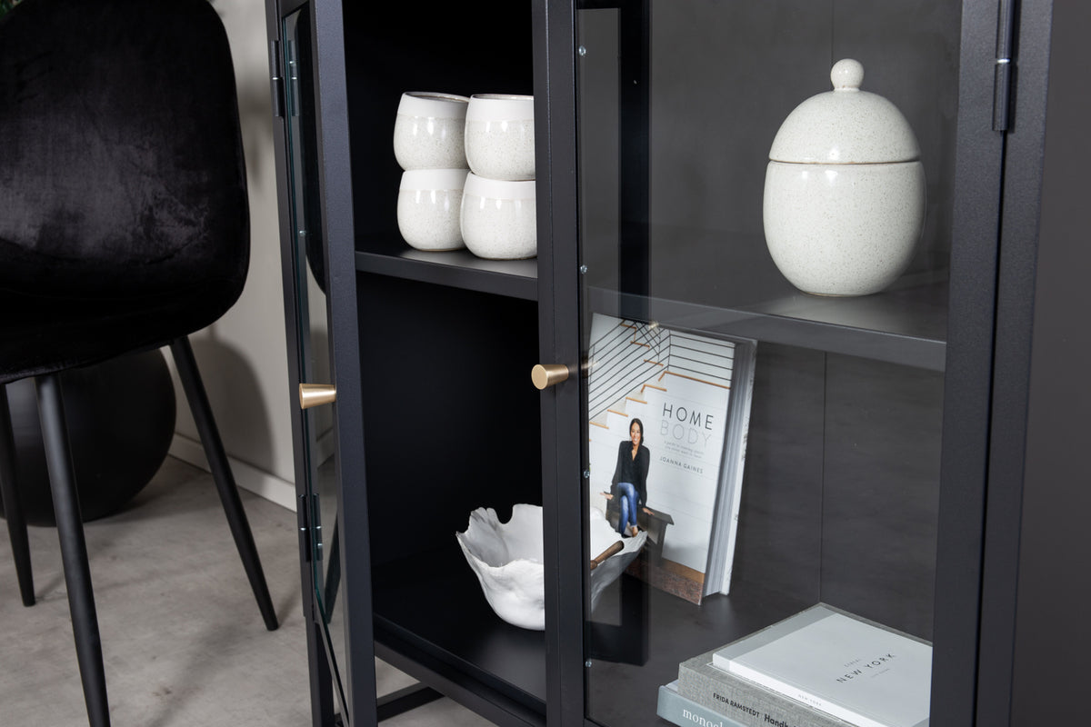 Baktal, modernia teollista muotoilua jauhemaalattua mustaa terästä, jossa on kaksi lasiovea, joiden runko on jauhemaalattua mustaa terästä ja kaksi kohopintaa. Ovissa on messinkinväriset nuput. Koko kaappi lepää mustaksi pulverimaalattua terästä olevan avokehyksen päällä. Mitat: Pituus: 85 cm, leveys: 40 cm, korkeus: 85 cm. Vaatii kevyemmän kokoonpanon.