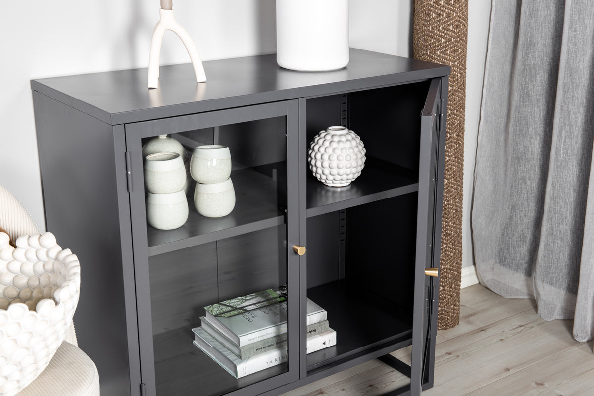 Baktal, modernia teollista muotoilua jauhemaalattua vaaleanharmaata terästä, jossa on kaksi lasiovea. Runko jauhemaalattua vaaleanharmaata terästä ja kaksi kohopintaa. Ovissa on messinkinväriset nuput. Koko kaappi lepää vaaleanharmaaksi pulverimaalattua terästä olevan avokehyksen päällä. Mitat: Pituus: 85 cm, leveys: 40 cm, korkeus: 85 cm. Vaatii kevyemmän kokoonpanon.