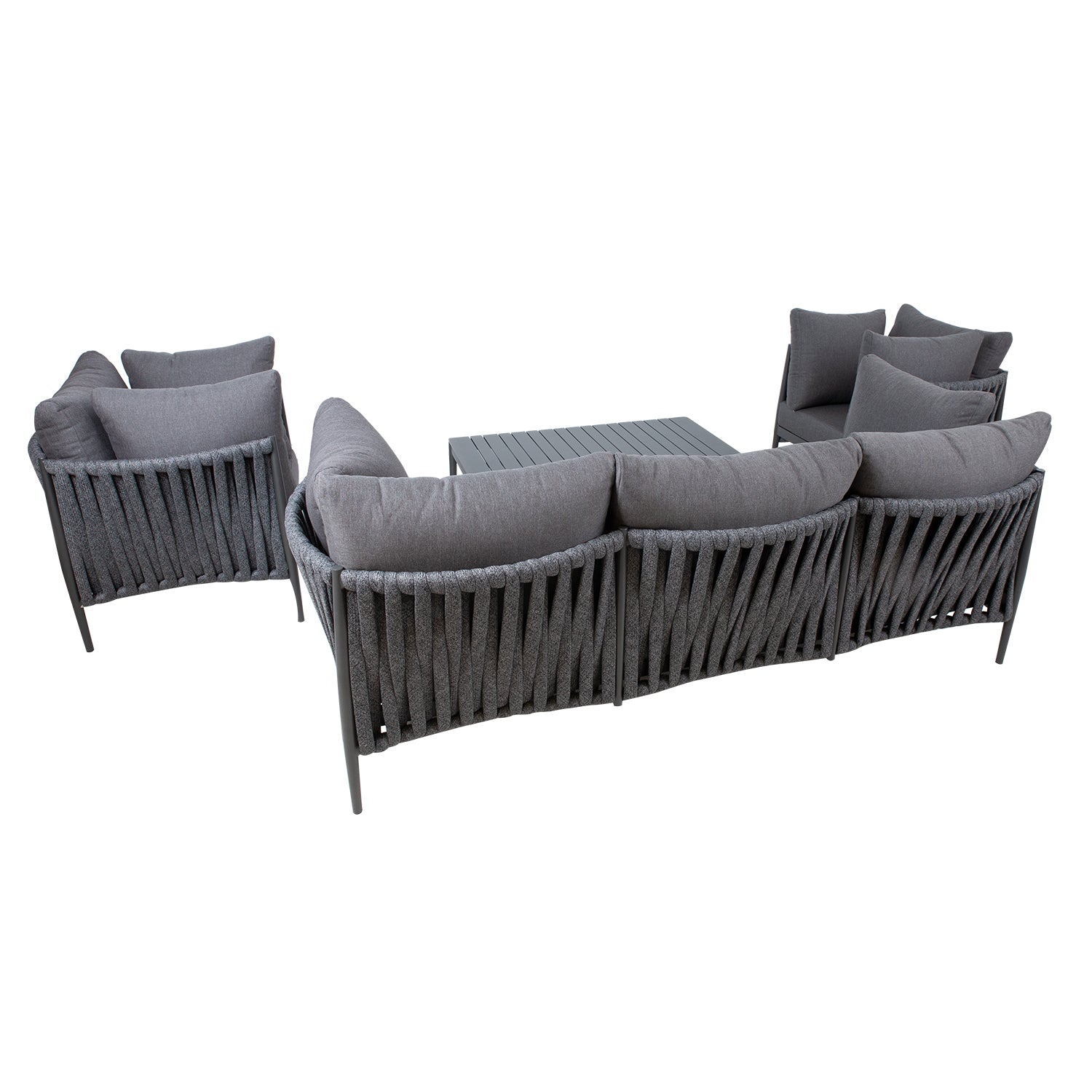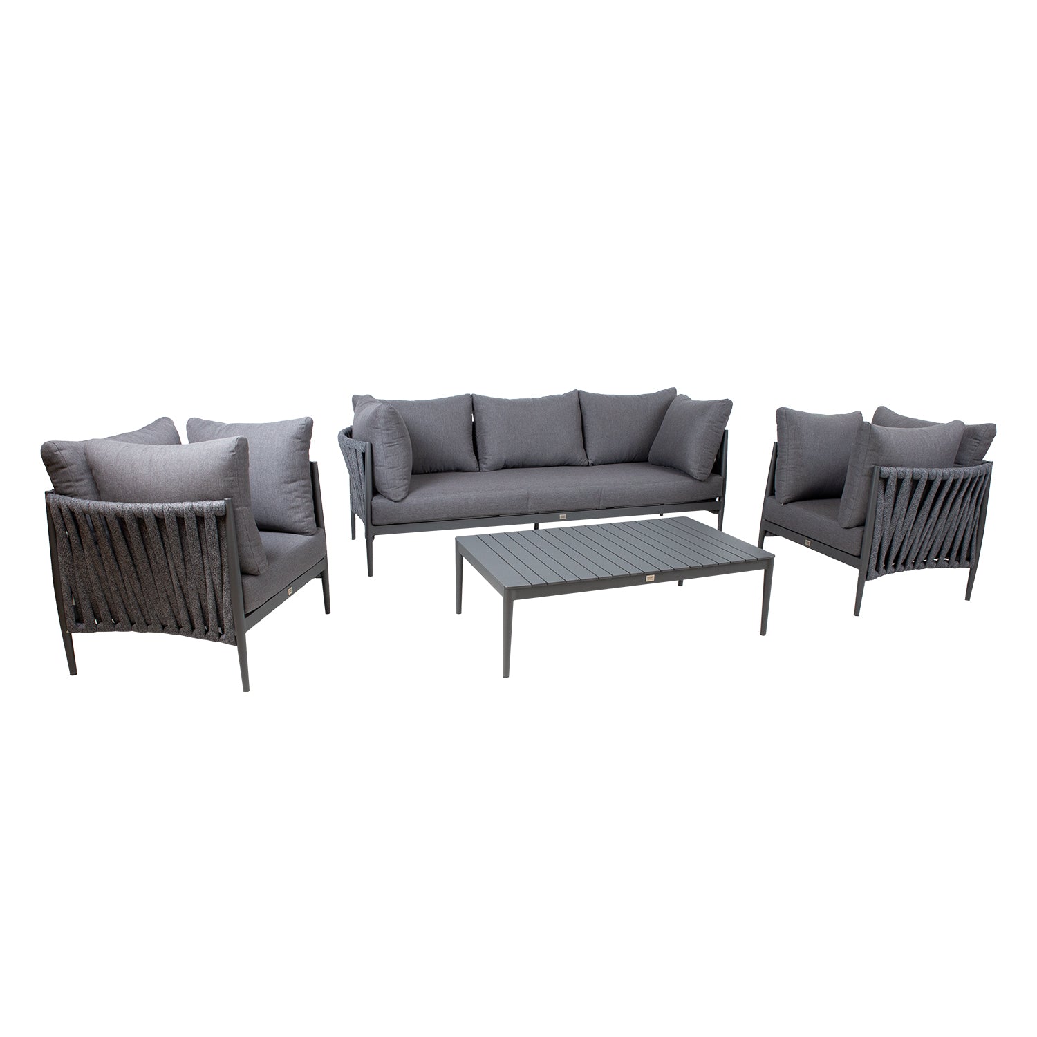 Material: aluminum frames. The sofa and chairs have rope braided seats. Seat cushions upholstered with polyester fabric.