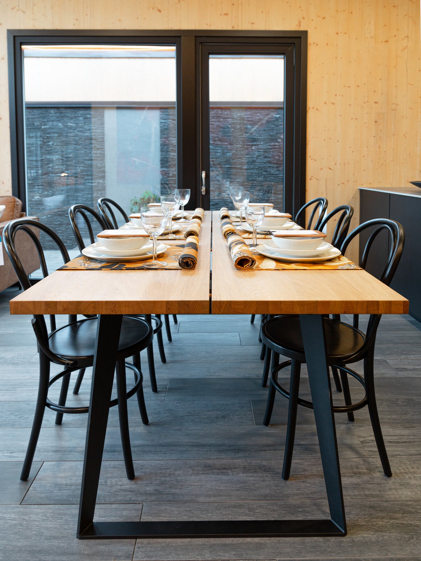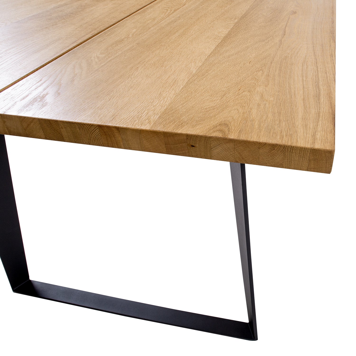 Tyylikäs kahdesta tammiviilutetusta levystä valmistettu pöydän kansi. Metalliset jalat tuovat pöytään lisää jykevyyttä nykypäivän suositun trendin mukaisesti.