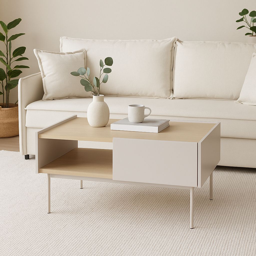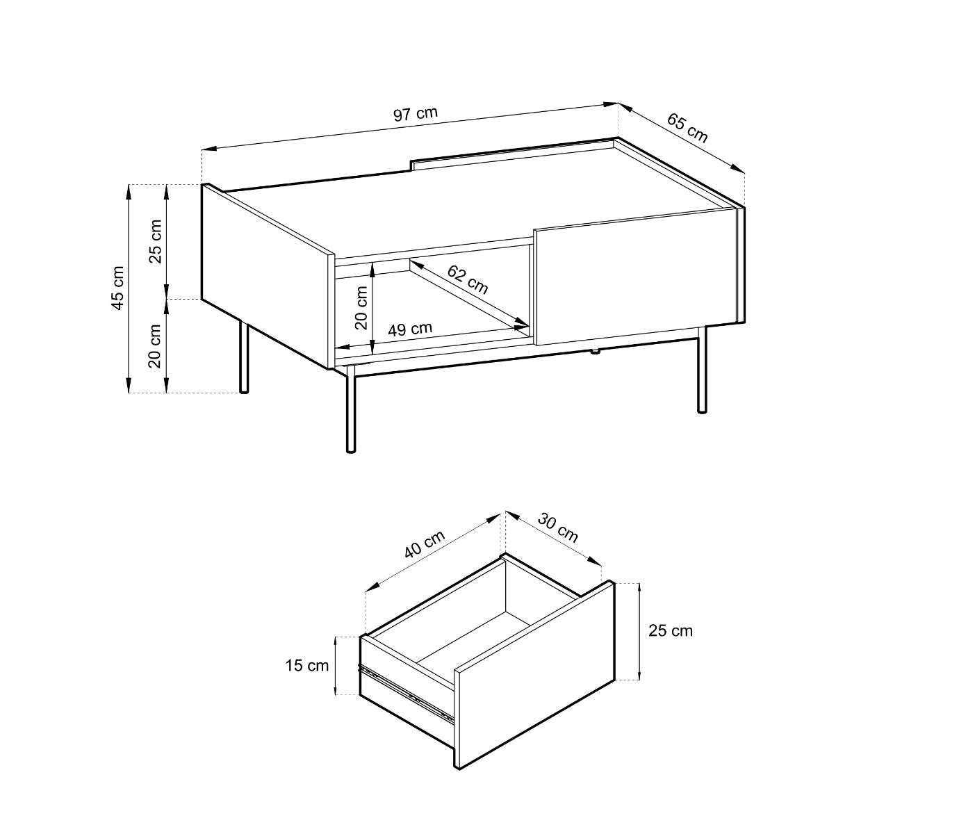 Tyylikäs ja kauniin linjakas Puuteri-sohvapöytä upeassa greigen sävyssä. Sohvapöydästä löytyy vetolaatikot metalliliukukiskoilla pöydän molemmin puolin sekä koko pöydän syvyinen avohylly. Sohvapöydän greige runko sekä laatikoiden etusarjat ovat 16 mm paksua laminoitua kalustelevyä ja molemmissa on ABS-reunanauha. Kansi, pohja sekä väliseinä ovat vaalean tammen väristä 16 mm paksua laminoitua kalustelevyä. Sohvapöydän greigen väriset jalat ovat pulverimaalattua metallia ja niiden korkeus on 20 cm. Sohvapöydän leveys on 97 cm, syvyys 65 cm ja korkeus 45 cm. Kantavuus 20 kg. Toimitus osina.